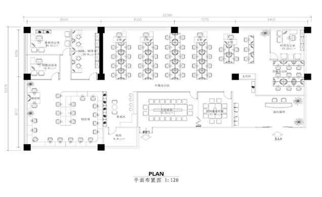強調功能性設計,吊頂造型簡約流暢,色彩對比強烈。給人帶來前衛、有活力的感覺。 開放性辦公室區域頂面使深灰色乳膠漆噴涂,墻面部分使用色彩豐富的橘色作為點綴,綠植和橘色方柱的融入給整體增添了不一樣的時尚感。