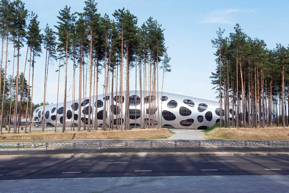 來自斯諾文尼亞的建筑設計公司 OFIS Architects 早前受委托在白俄羅斯鮑里索夫當地設計建造一個前衛而壯觀的大型足球場。足球場坐落在一大片綠樹環繞的樹林中心,扁平而圓滑的奇特造型由光滑的銀白色鋼化外墻面板以及不規則穿孔的結構框架所組成;而球場共有 7 個樓層,共可以提供 13,000 個觀眾親臨現場感受比賽,而 85 米 X 105 米尺寸的綠蔭球場加上世界級的頂尖室內音響聲效,無疑成為世界足球迷的最為期待親臨的球場之一。