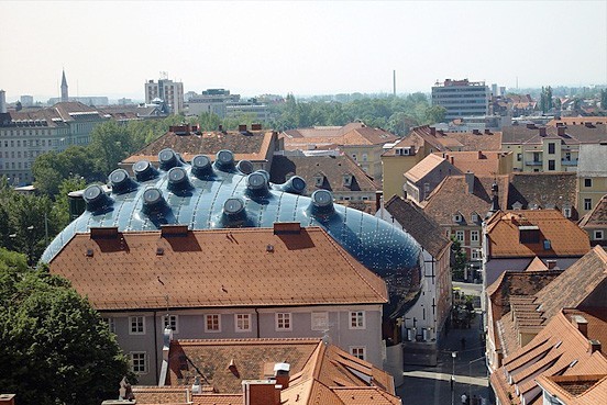 Kunsthaus Graz為英國建筑師彼得庫克(Peter Cook)的作品,以藍色的塑料玻璃拼貼而成,當地人親切地稱之為“友善的外星人”(a friendly alien)。座落在格拉茨市中心的超現實主義建筑與紅頂尖塔的古堡、鐘樓所形成的強烈反差是格拉茨最經典的標志景觀。
